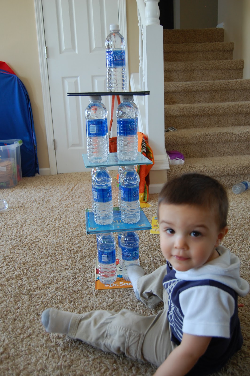 Levi likes to build towers just to knock them down (what boy doesn't). It was really hard for him to leave this water bottle tower alone long enough to take a picture. He also loves to roll around in piles of things, like clean or dirty clothes, water bottles, diapers, basically anything he can put in a pile and hop on.